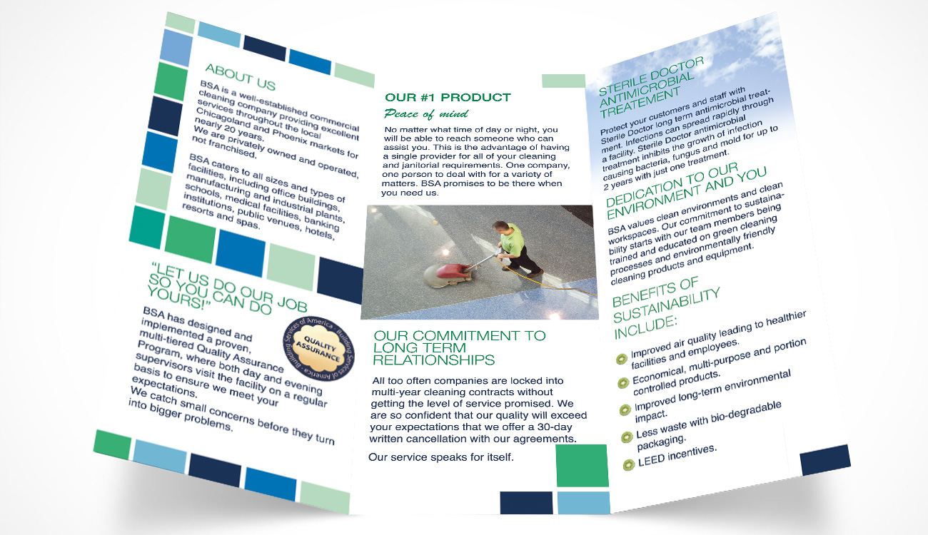 Design si print pliant BSA. La solicitarea departamentului de vanzari al Building Services of America am realizat si designul pliantului pe care acestia sa il foloseasca in promovarea serviciilor profesionale de curatenie pe care le ofera.